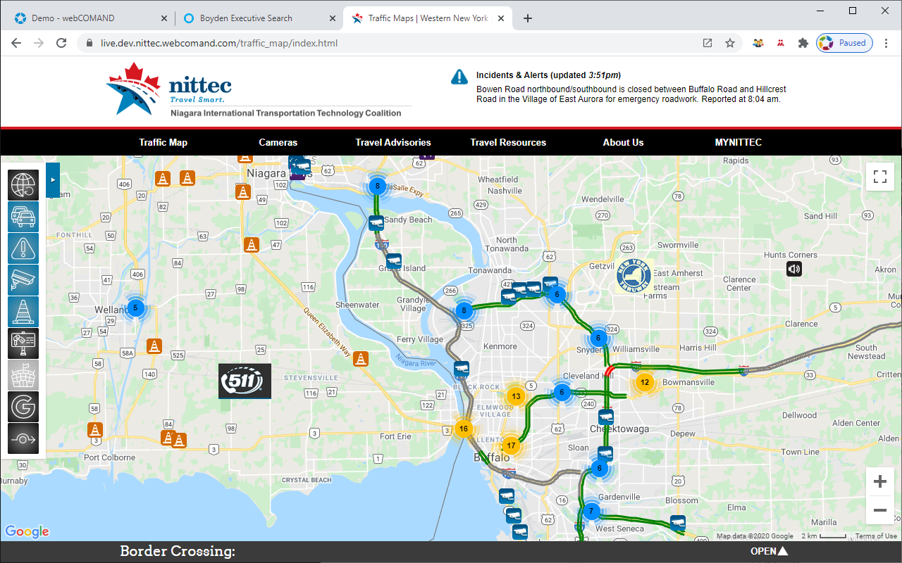 This conglomeration of agencies provide traffic information to Western New York and Southern Ontario needed to streamline the management and presentation of their various data feeds, content and systems on the web and mobile devices within a visually striking and easy to comprehend user interface.